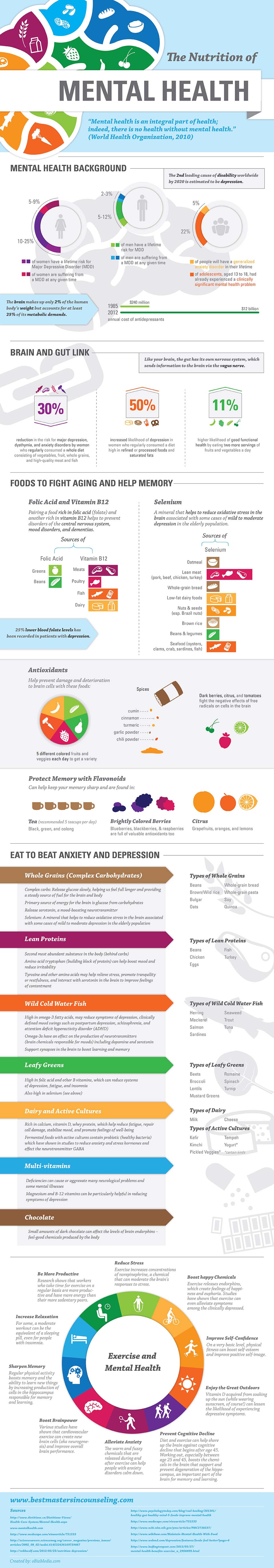 This infographic has some good information regarding the relationship between nutrition, the gut and mental health. I do not completely endorse all of the information in it, however.